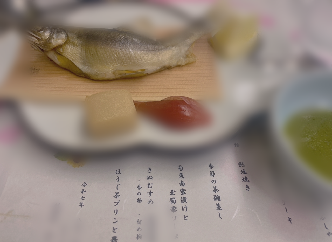 お昼に 来れたらいいなぁ(。・ω・。) 👨都合で変わってしまうけど 連休中もお願いします🧡 鮎の塩焼き🐟の写真で✨✨ みょうがの横は 玉ねぎ🧅の練り物で 初めて食べる食感と味でした🥰