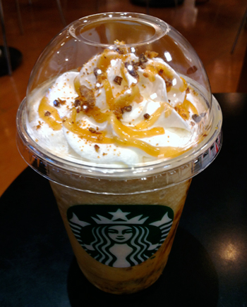 スタバラー(スタバ好きw)な日向です☆ 期間限定で発売中のクランチキャラメルフラペチーノ、どはまり中! すっごく美味しいんだよ♪ 寒くても、頼んじゃう(笑) しかし、一番小さいShortサイズでも332キロカロリー。 甘いし、ホイップクリームもたっぷりのってるし、やむをえんっ(開き直りっ) せめてもの抵抗って事で、ミルクを無脂肪乳にしてみまする。 それでも304キロカロリーだけどね!ぷぷぷ・・・
