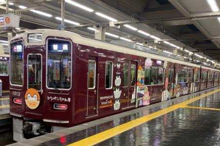 阪急電鉄がコウペンちゃんとコラボしてました♪ コウペンちゃんラッピング可愛い~(*^^*) 神戸線、宝塚線、京都線で絵が違うみたいです♪ 写真は何路線か、わかりますか(・ω・)?