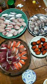 寿司(改) ネタ…サーモン まぐろ ひらまさ こはだ しめさば たい いくら 前回握った寿司が全体的にシャリが大きめだったと言われたことで、今回はシャリを小さめに握ってみました。 ……… たいして変わってない? 相変わらずネタに比べてシャリが多いような? 寿司作りが上達するまではまだまだ時間が必要です。